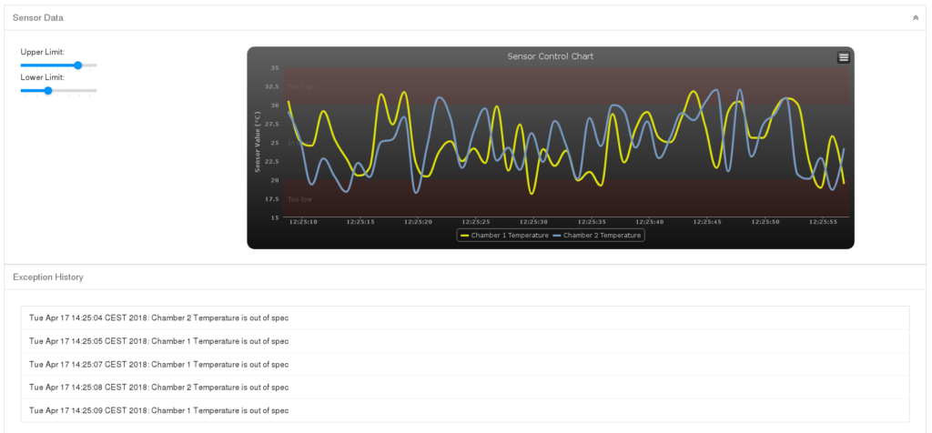 The result is a web application, showing sensor data as it is flowing in, and updating a table with sensors violating their limits.