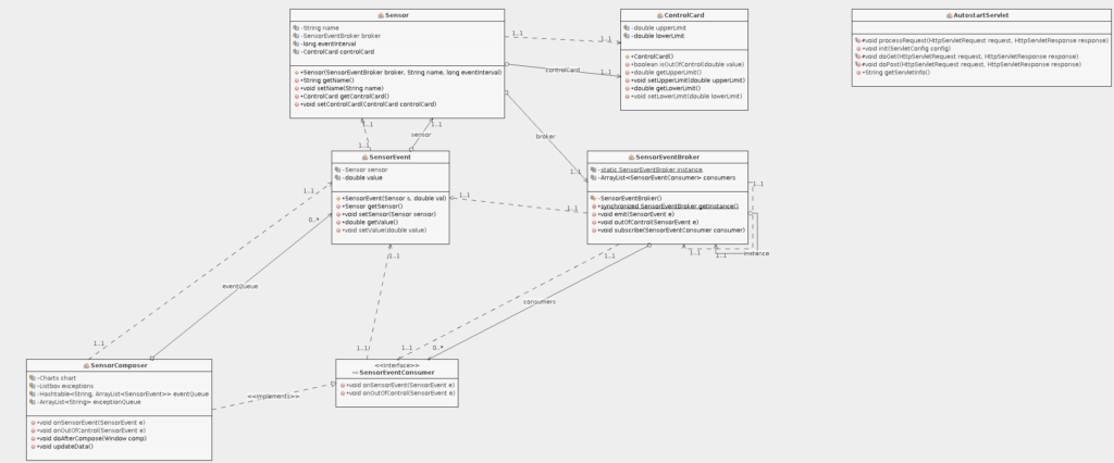 • Sensor Event Consumer: can subscribe to sensor events using the broker and will receive events and „out of control“ exceptions when sensors violate their limits